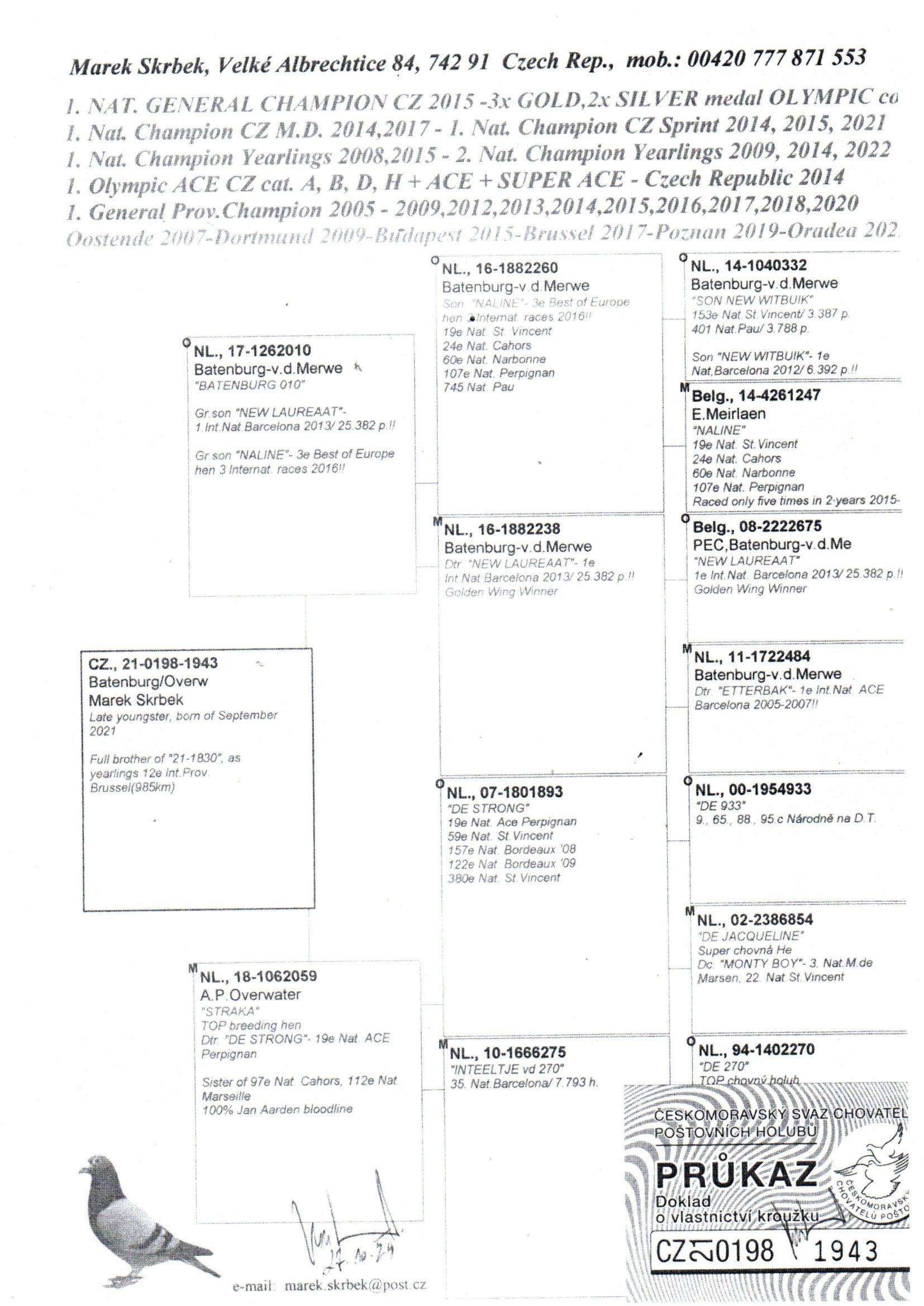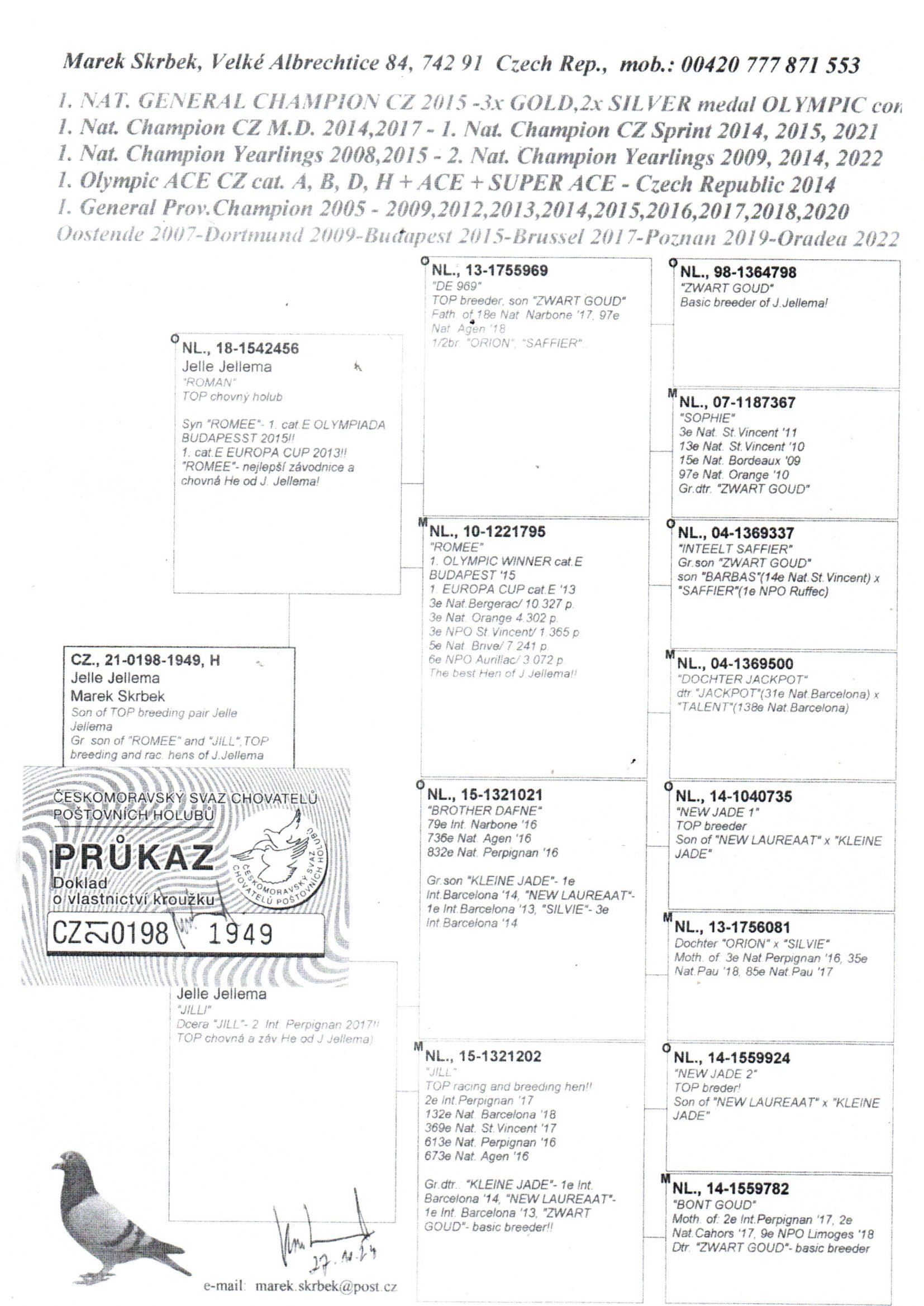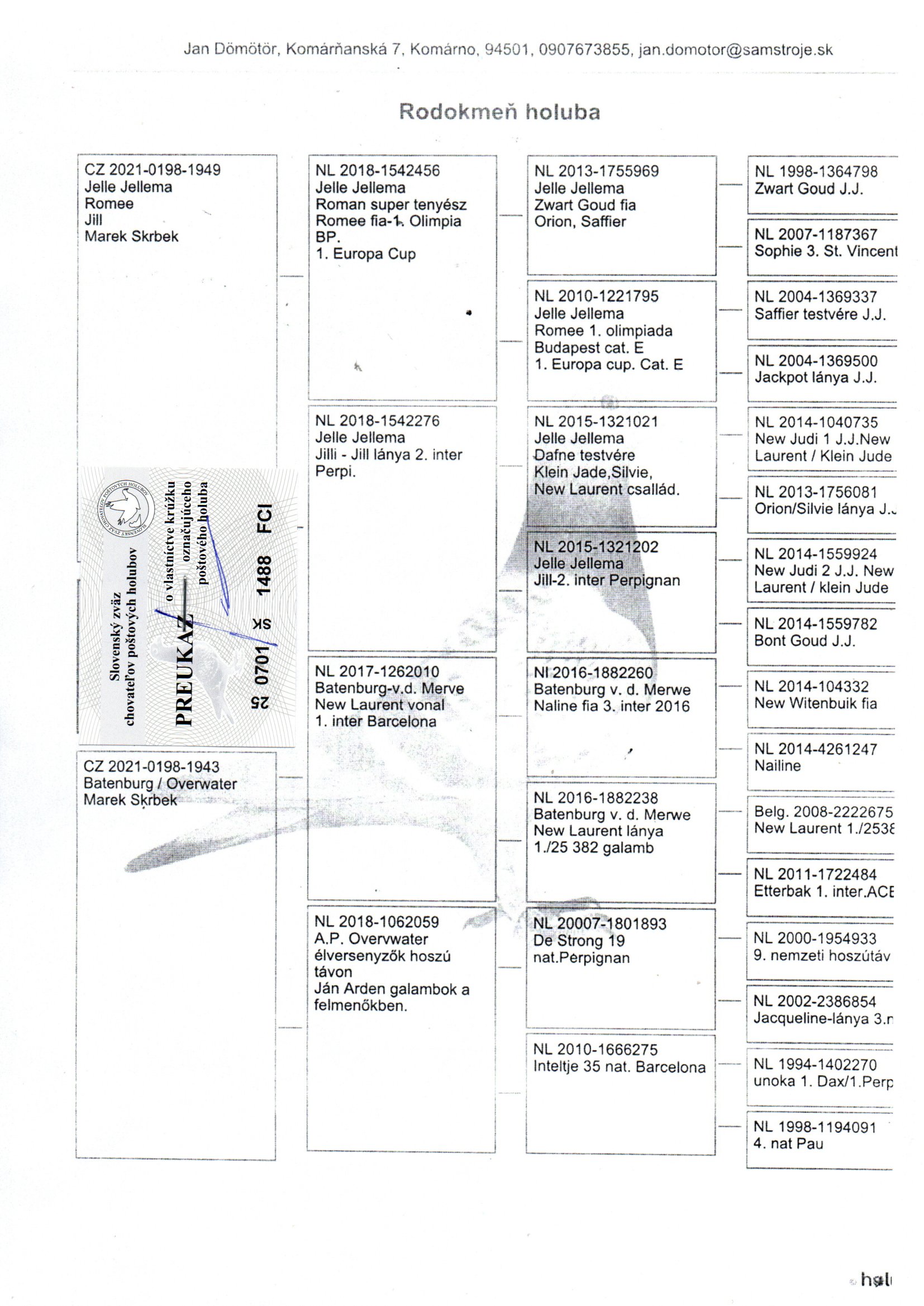 Jellema Zwart Goud,Romee(1 Olimpiai galamb a Budapesti Olimpián)Kleine Jade(1 Nemzetközi Barcelóna),valamint Batenburg/vd.Merwe Nieuw Laureaat(1 Nemzetközi Barcelóna)híres galambok származásában!!!