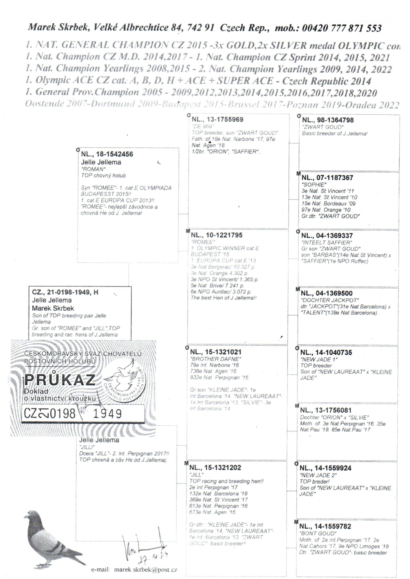 Jellema Zwart Goud,Romee(1 Olimpiai galamb a Budapesti Olimpián)Kleine Jade(1 Nemzetközi Barcelóna),valamint Batenburg/vd.Merwe Nieuw Laureaat(1 Nemzetközi Barcelóna)híres galambok származásában!!!